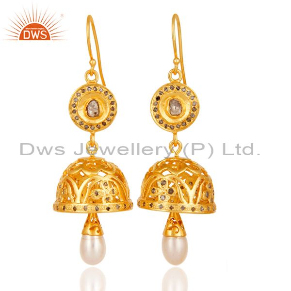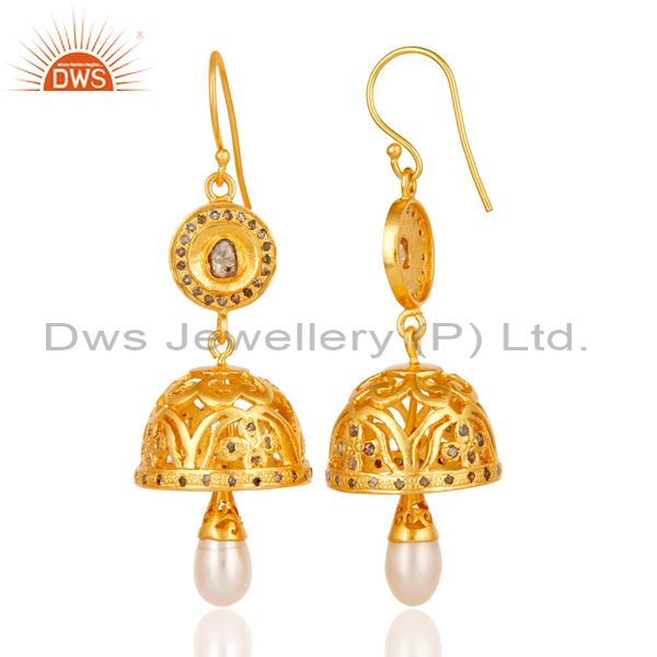 Diamond & Pearl Handmade Jhumka Earrings with 18k Gold Plated Sterling Silver