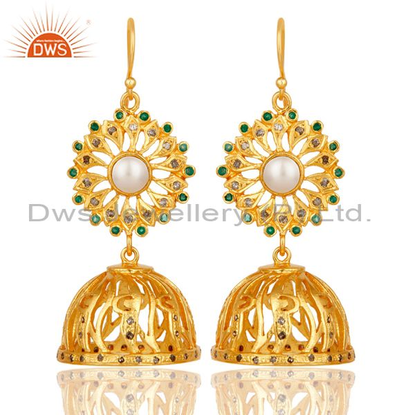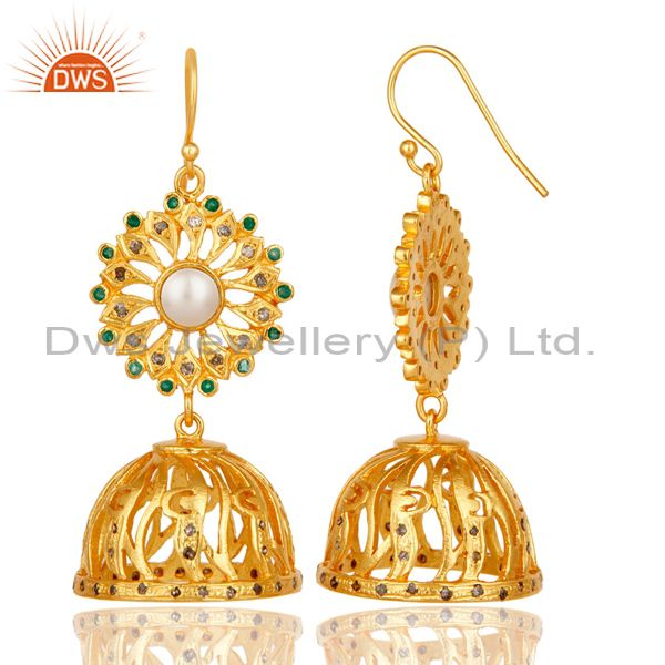 Diamond, Emerald & Pearl 18k Gold Plated Sterling Silver Jhumka Earrings