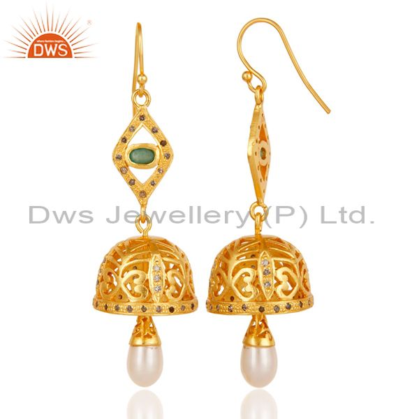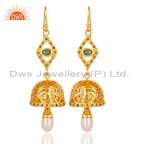 Diamond, Pearl & Emerald 18k Yellow Gold Plated Sterling Silver Jhumka Earrings
