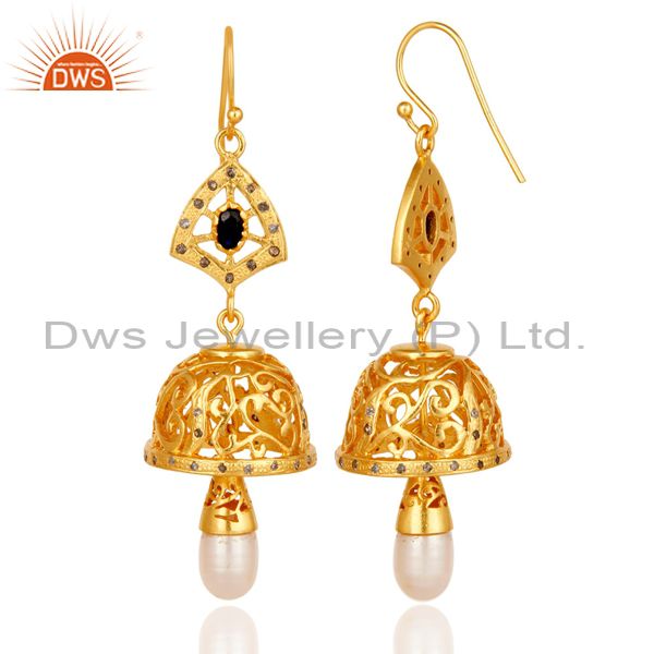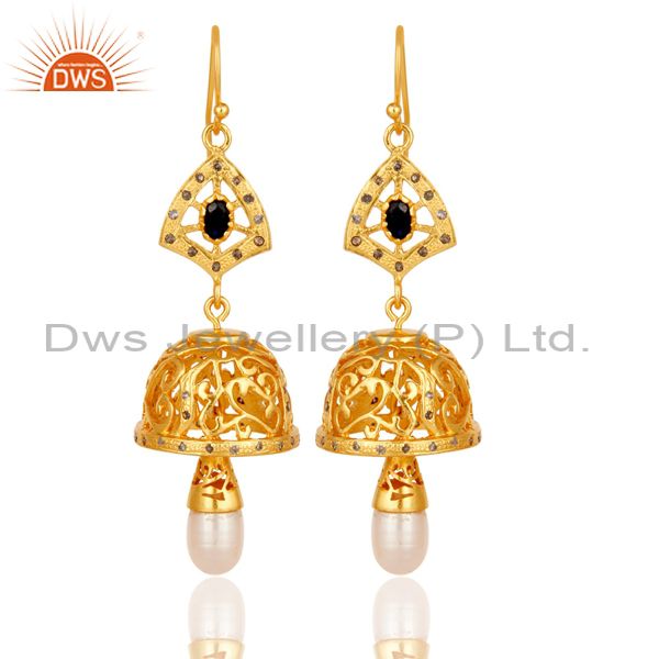 Diamond, Sapphire & Pearl Jhumka Earrings with 18k Gold Plated Sterling Silver