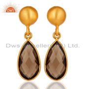 Double Faceted Natural Smoky Quartz Plated Gold Sterling Silver Bezel Earrings