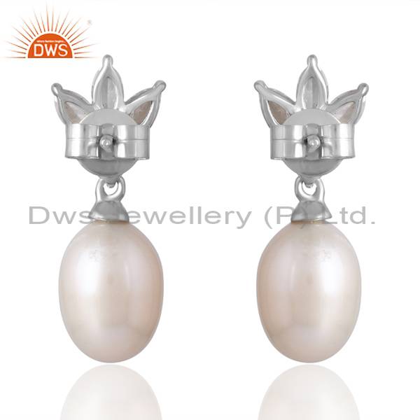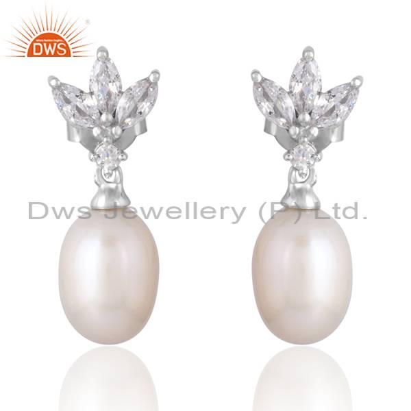 Elegant 18K Gold Silver Pearl Drop Earrings With Cz Stones