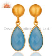 Faceted Dyed Blue Chalcedony Gemstone Dangle Earrings In 18K Gold Over Silver