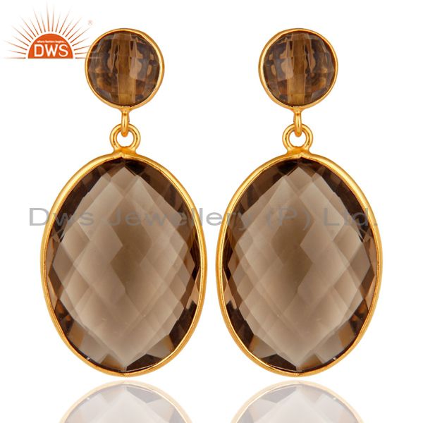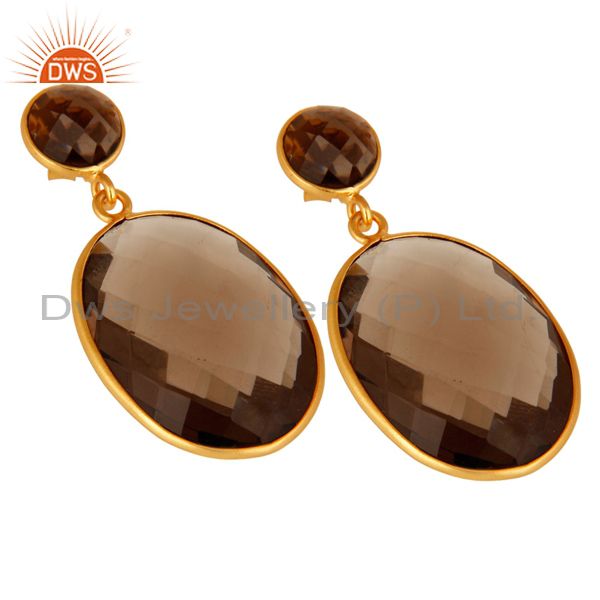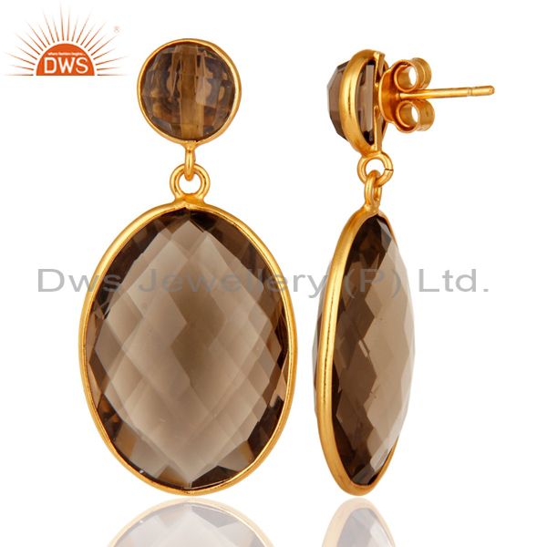 Faceted Smoky Quartz Gemstone Gold Plated Sterling Silver Dangle Earrings
