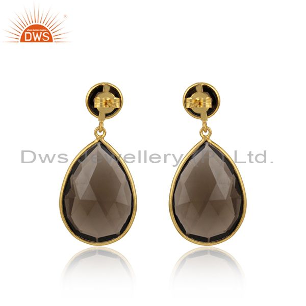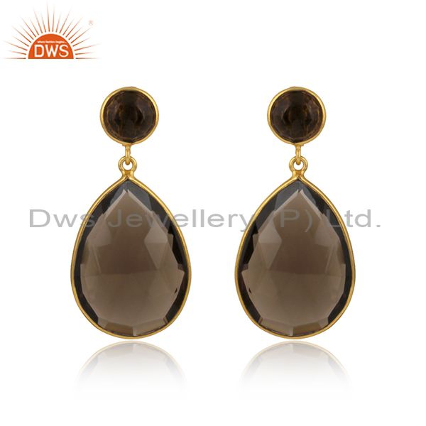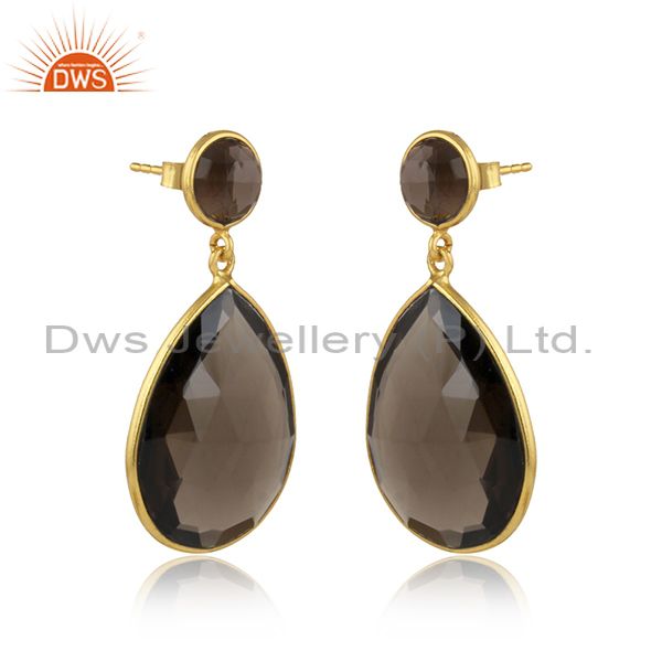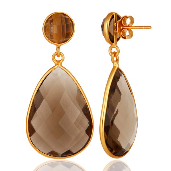 Faceted Smoky Quartz Gemstone Sterling Silver Drop Dangle Earrings - Gold Plated