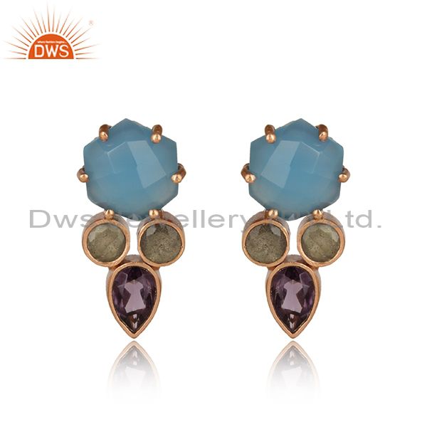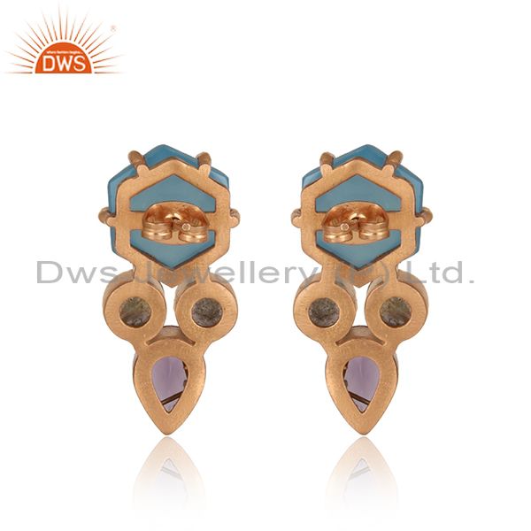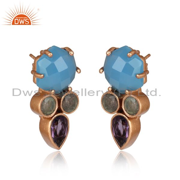 Fashion Gold Studs With Blue Chalcedony Hydro Amethyst Labradorite