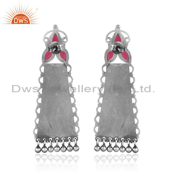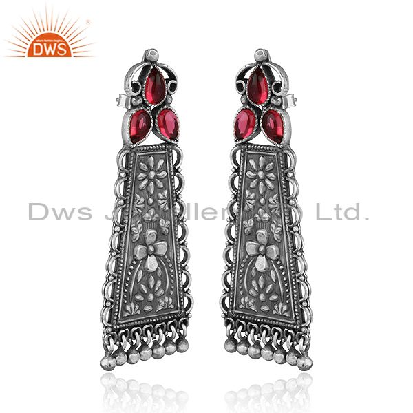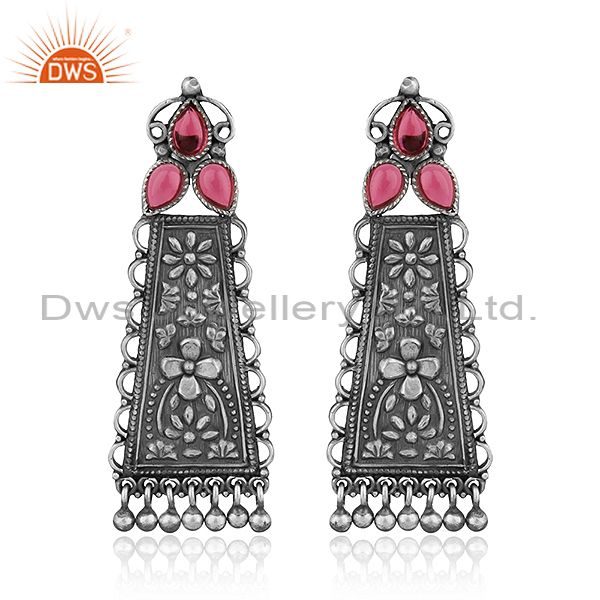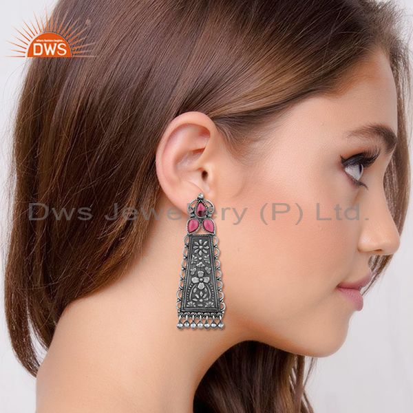 Floral Carved Hydro Pink Gemstone Oxidized 925 Silver Earrings Jewelry