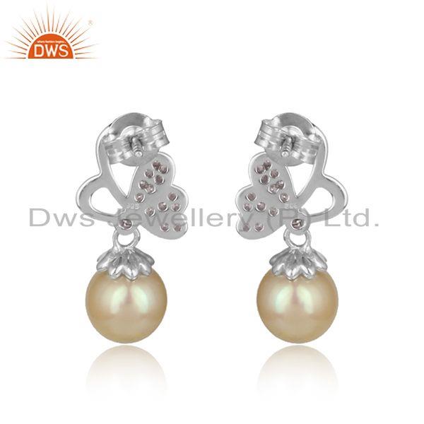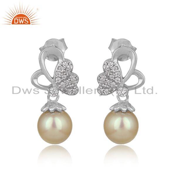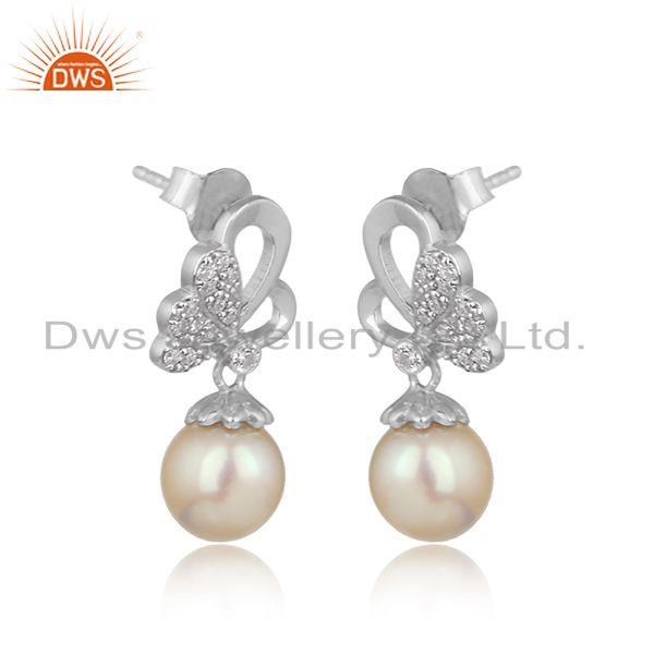 Floral Design Artisan Cz Earring In Silver 925 With Dangling Pearl