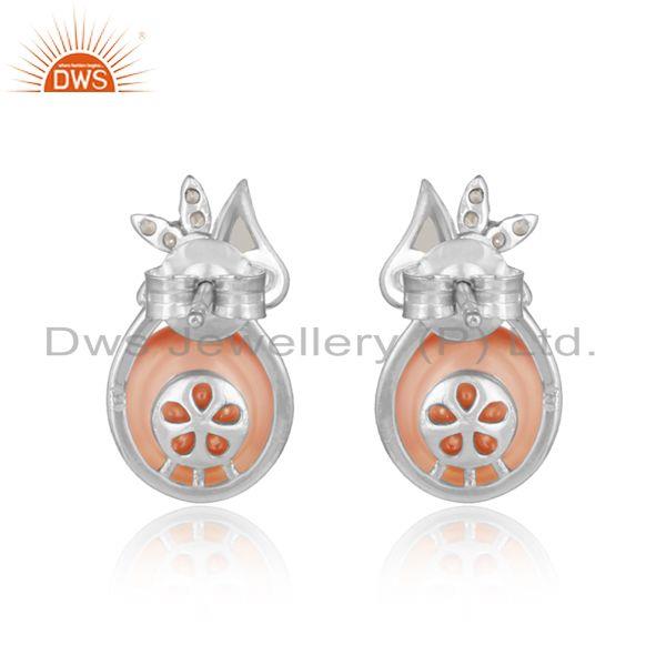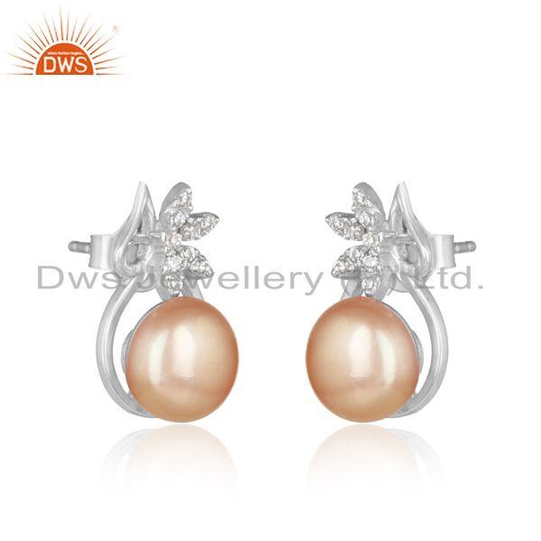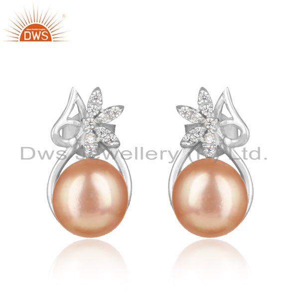 Floral Designer Rhodium On Silver 925 Studs With Cz And Pink Pearl