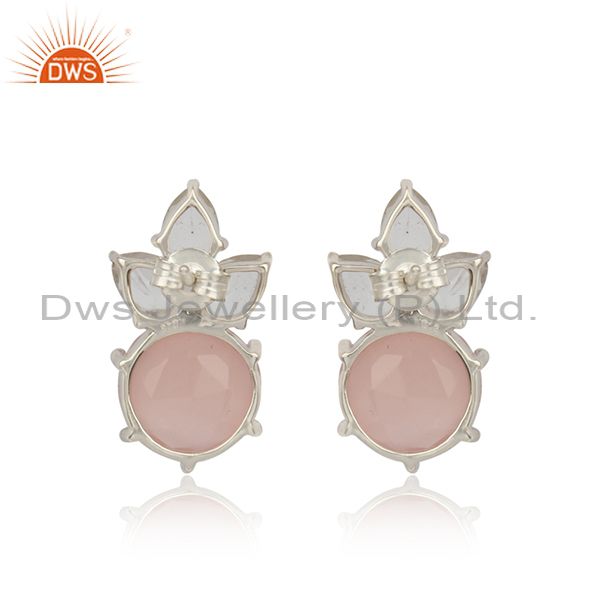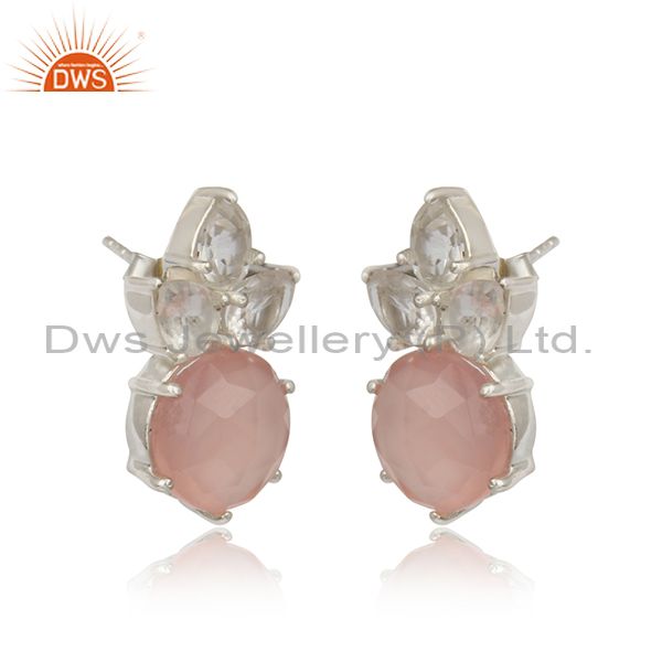 Floral Designer Silver Studs With Rose Chalcedony And Crystal
