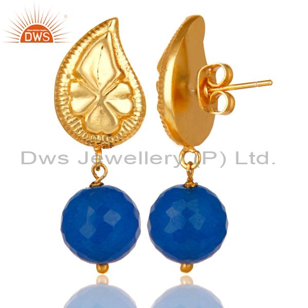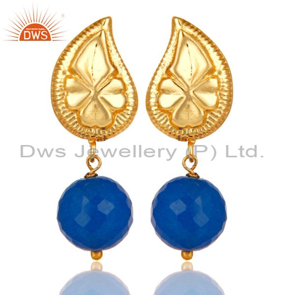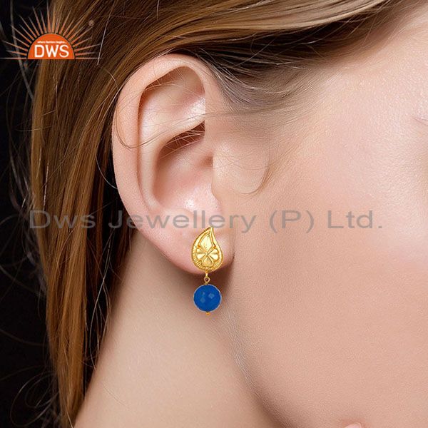 Flower Carving Blue Chalcedony Drops Brass Earrings Made In 14K Gold Plated