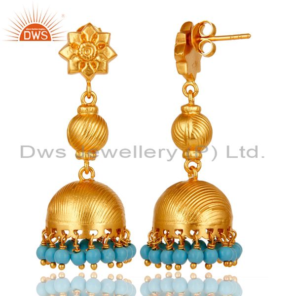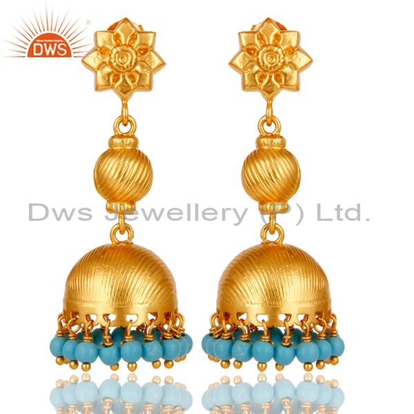 Flower Carving Jhumka Earrings with 18k Gold Plated Sterling Silver & Turquoise