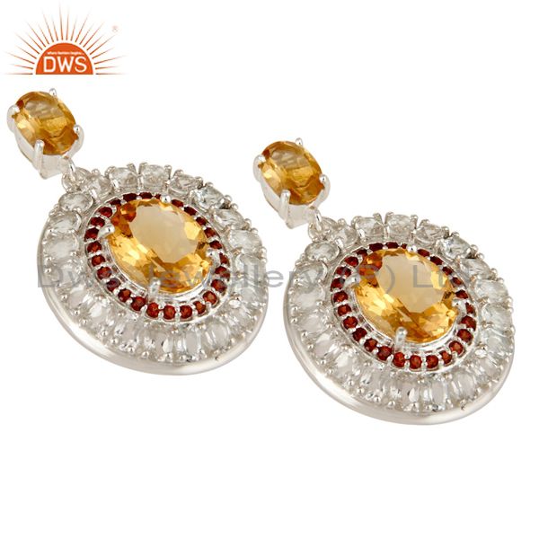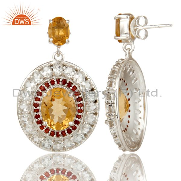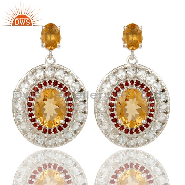 Genuine 925 Sterling Silver Citrine, Garnet Gemstone Dangle Earring White Topaz