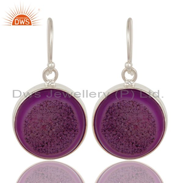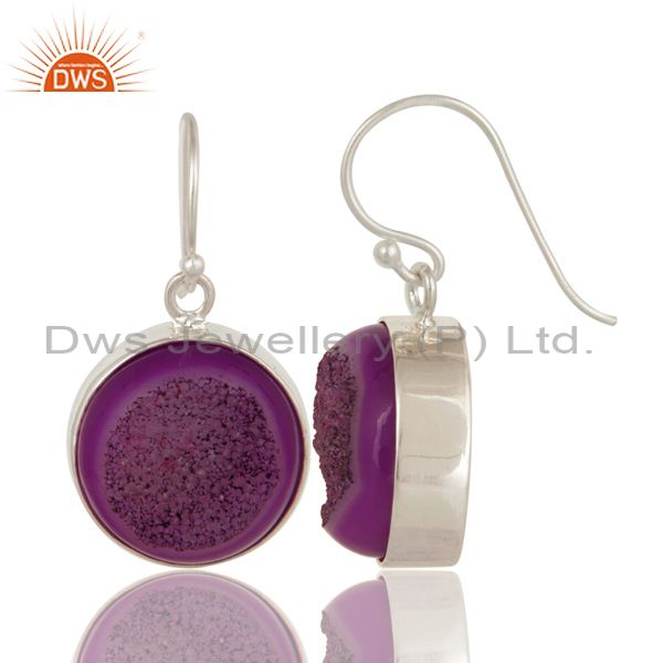 Genuine Sterling Silver Purple Druzy Agate Round Shape Bezel Set Hook Earrings
