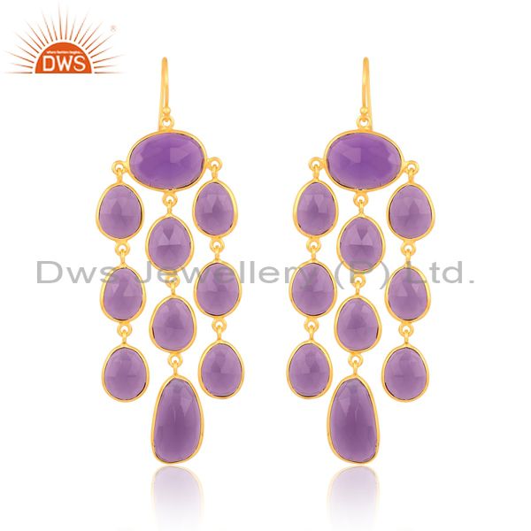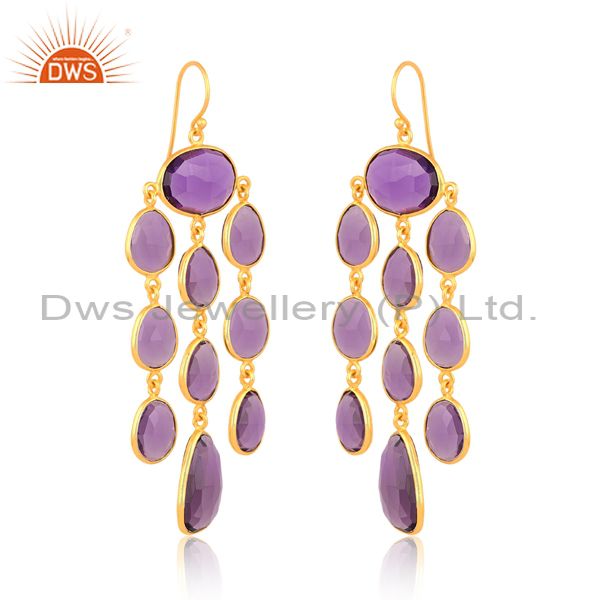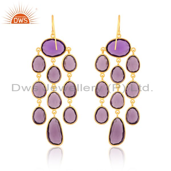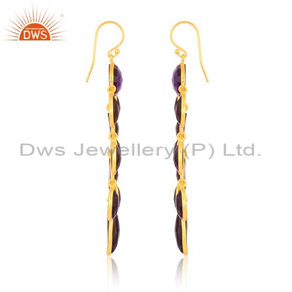 Glass Amethyst Set 18K Gold On 925 Silver Long Drop Earrings