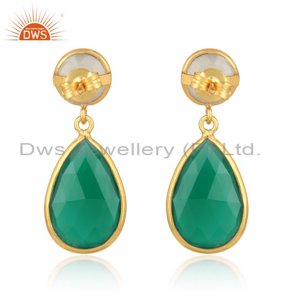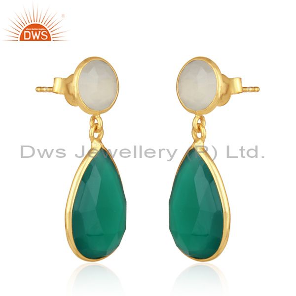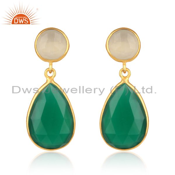 Gold On Silver 925 White Moonstone & Green Onyx Drops Earrings