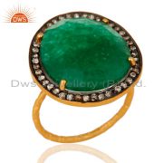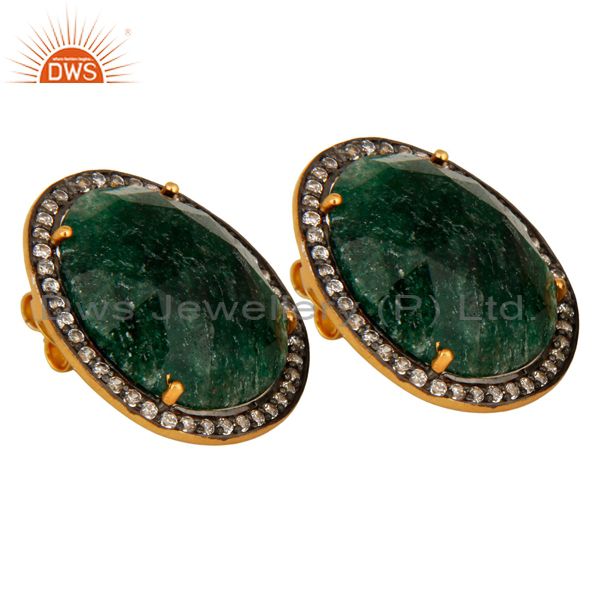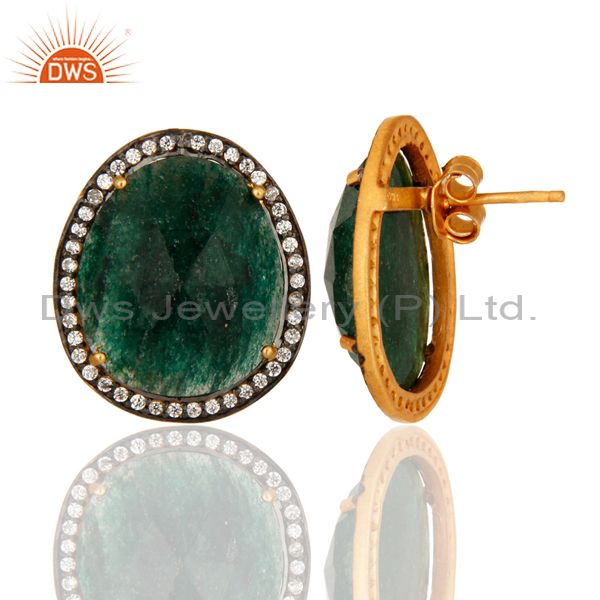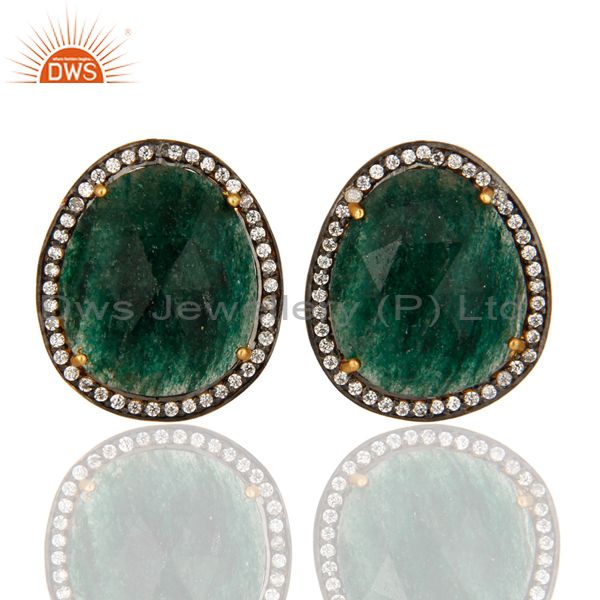 Gold Plated 925 Sterling Silver Green Aventurine Gemstone Stud Earrings With CZ