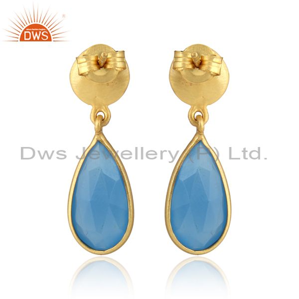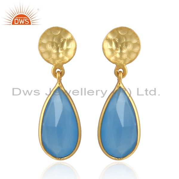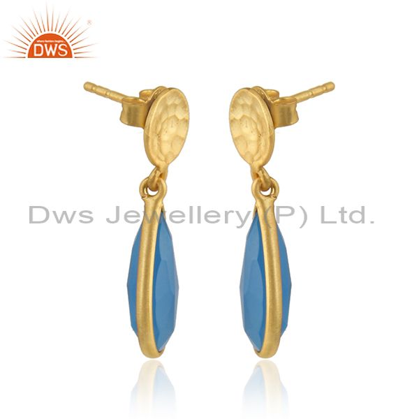 Gold Plated Designer Silver Blue Chalcedony Gemstone Dangle Earrings