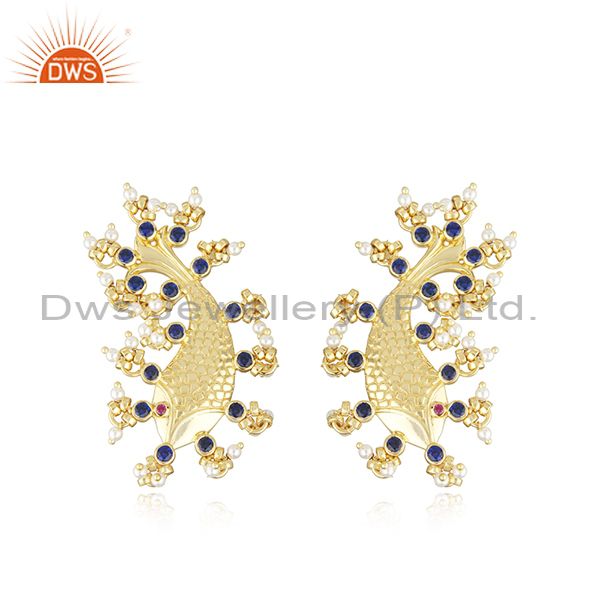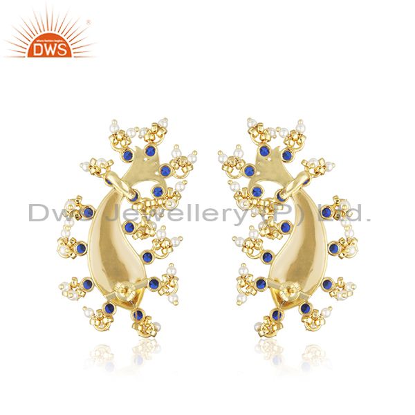 Gold Plated Silver Zircon Natural Pearl Statement Fish Stud Earrings