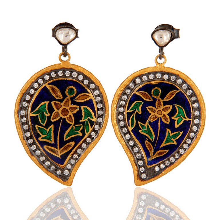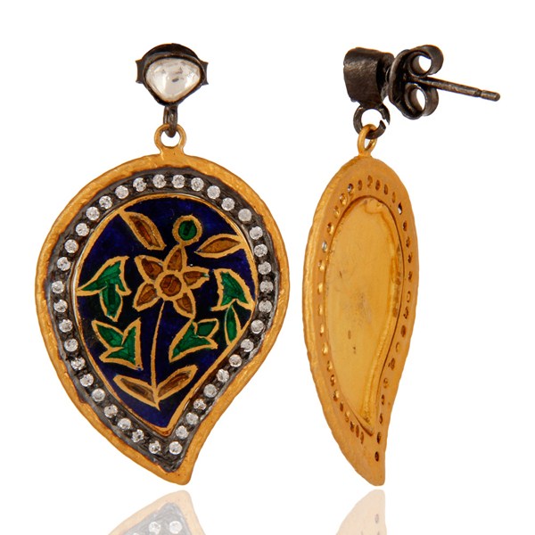 Gold Plated Sterling Silver Antique Mughal Style Kundan Meena Enamel Earrings