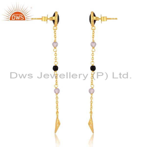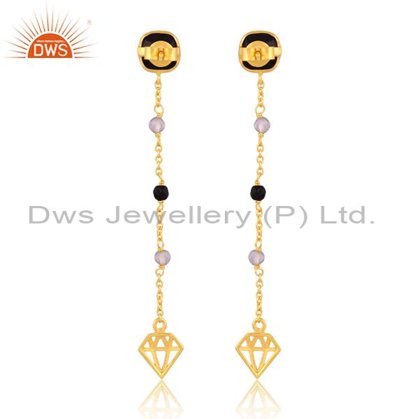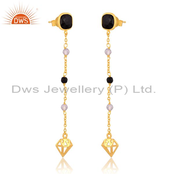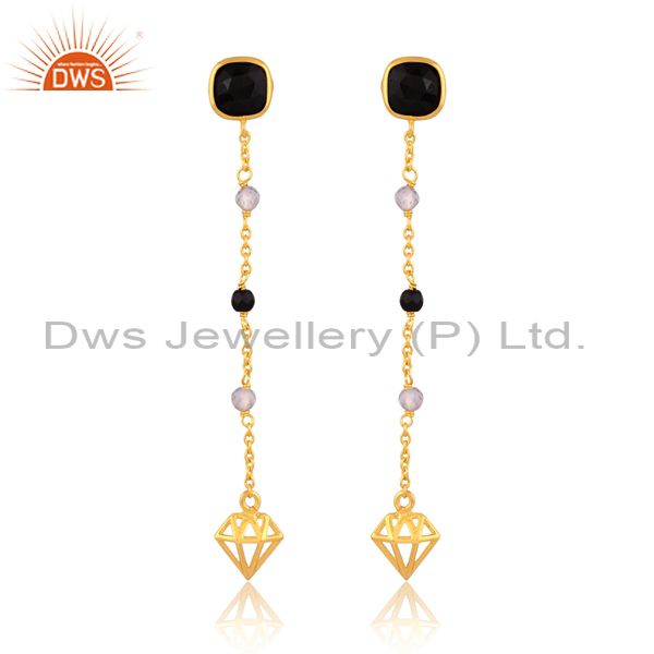 Gold Silver Earring With Crystal Quartz & Black Onyx Stone