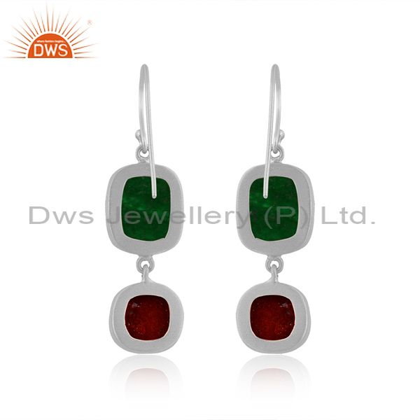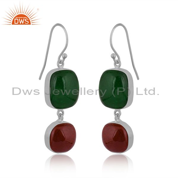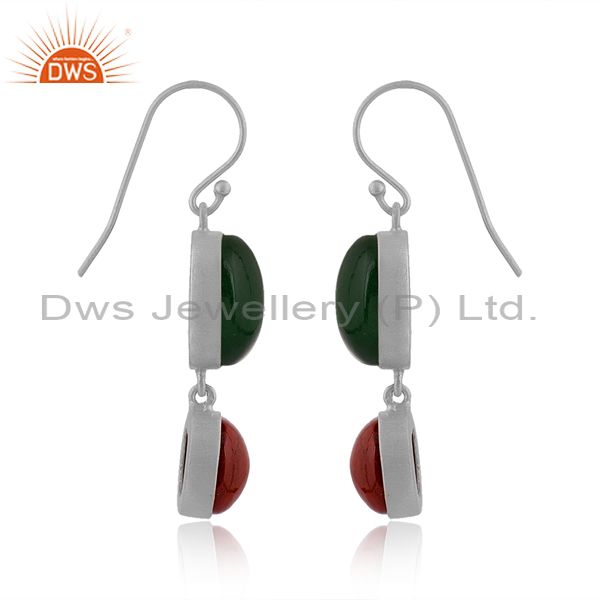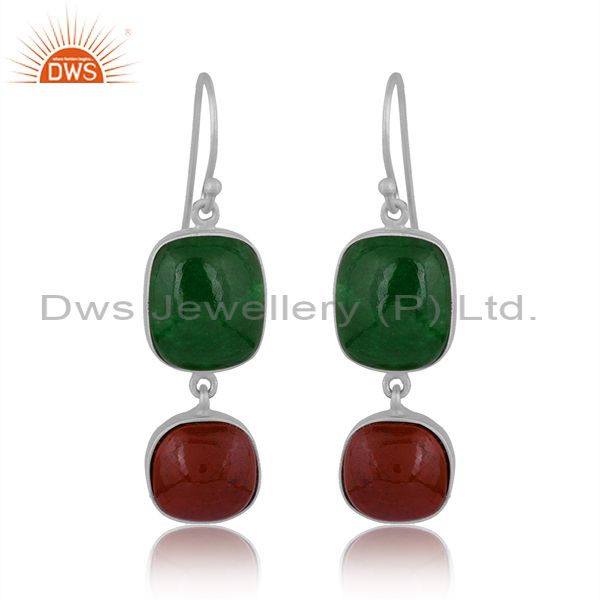 Green Jade, Red Jasper White Rhodium On Silver Long Earrings