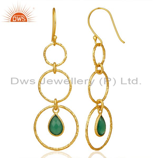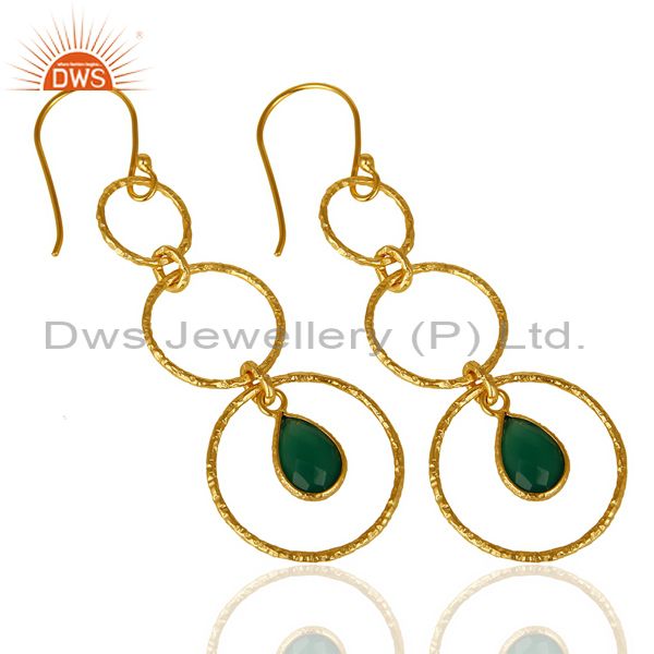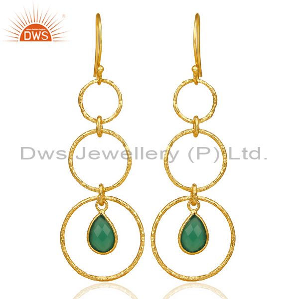 Green Onyx Hammered Circle Dangle 14K Gold Plated 92.5 Sterling Silver Earring