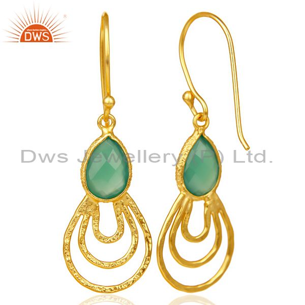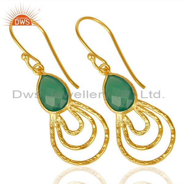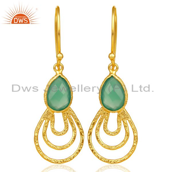 Green Onyx Hammered Drop Dangle 14K Gold Plated 92.5 Sterling Silver Earring