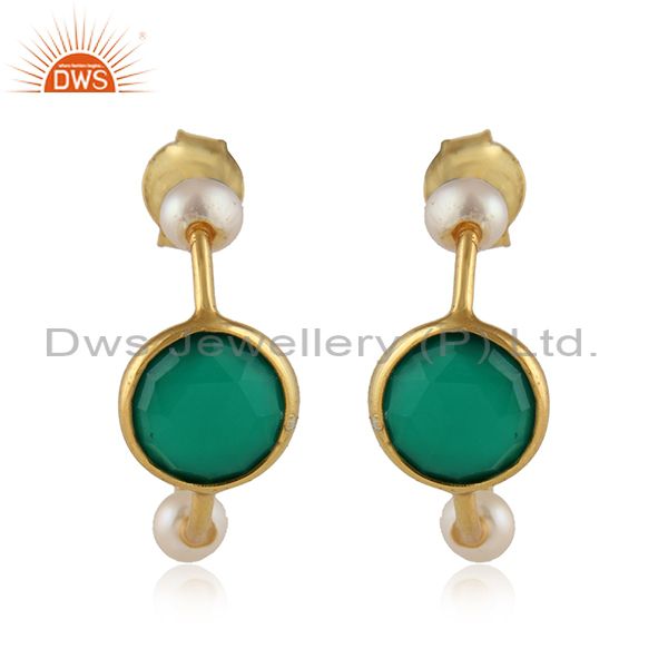 Green Onyx Pearl Gemstone Gold Plated Designer Silver Earrings