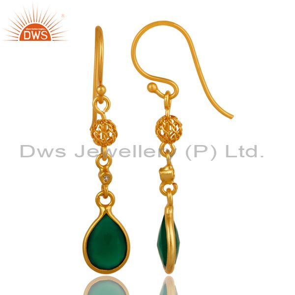 Green Onyx White Topaz Dangle Filigree 14K Gold 92.5 Sterling Silver Earring