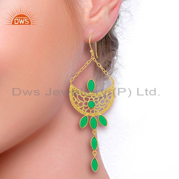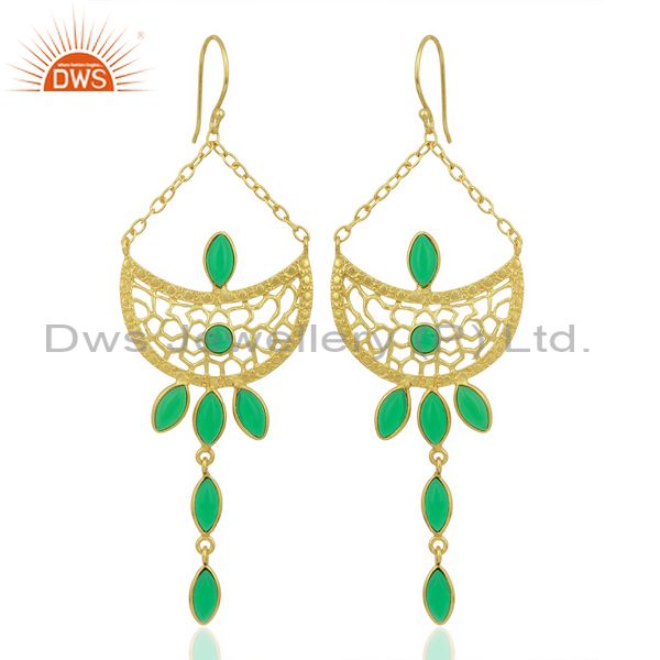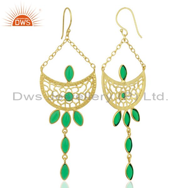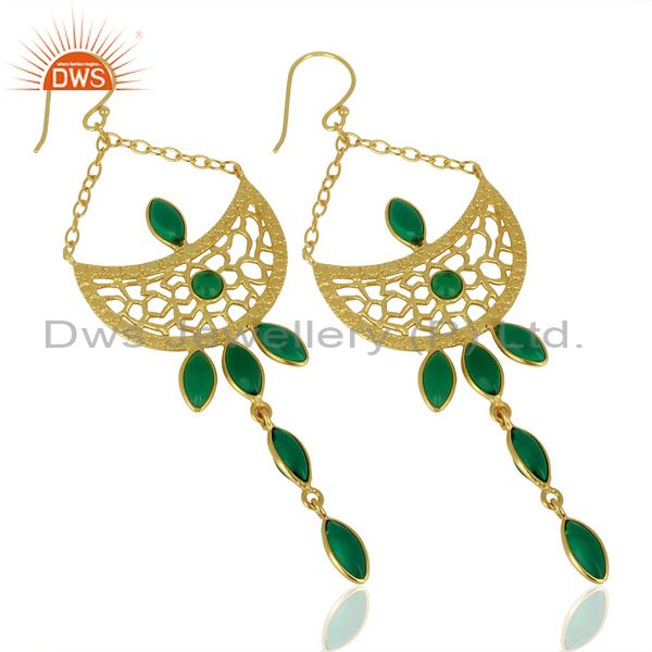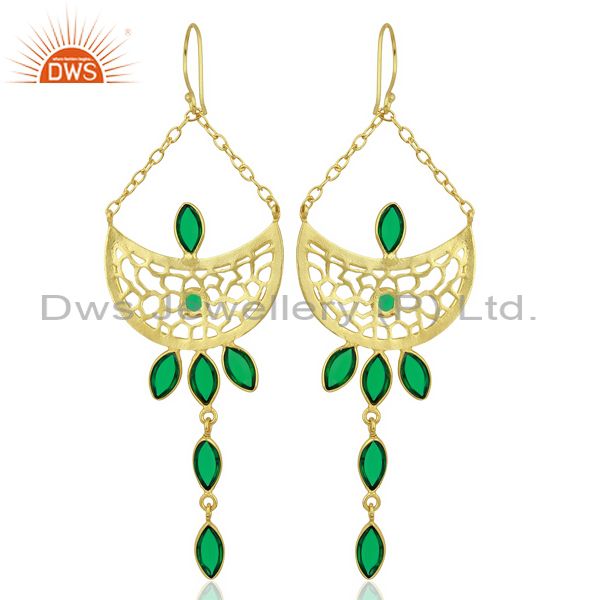 Green Stone Long Filigreen 14K Gold Plated Fashion Earring