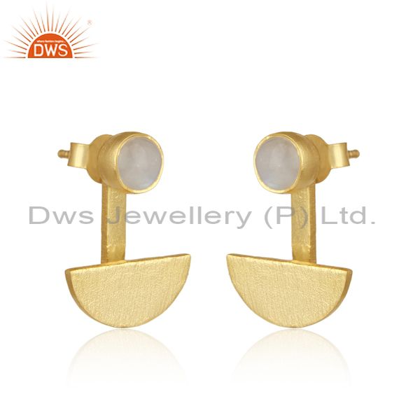 Half Moon Designer Gold on Silver Rainbow Moonstone Earring