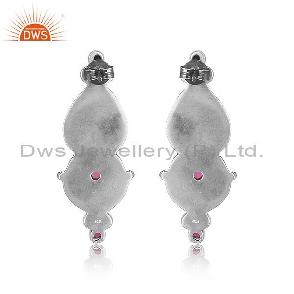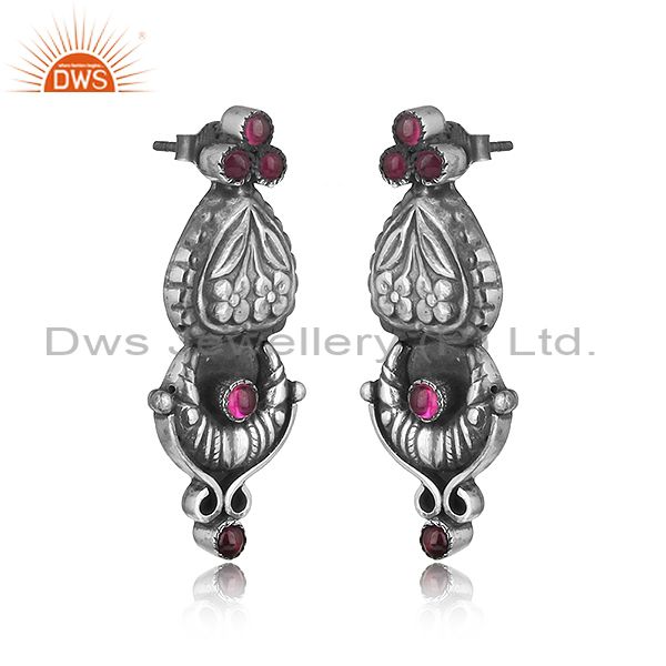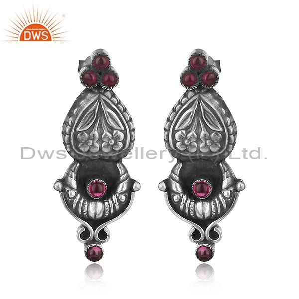 Handcrafted Floral design Tribe Red Stone Earring in Oxidized Silver