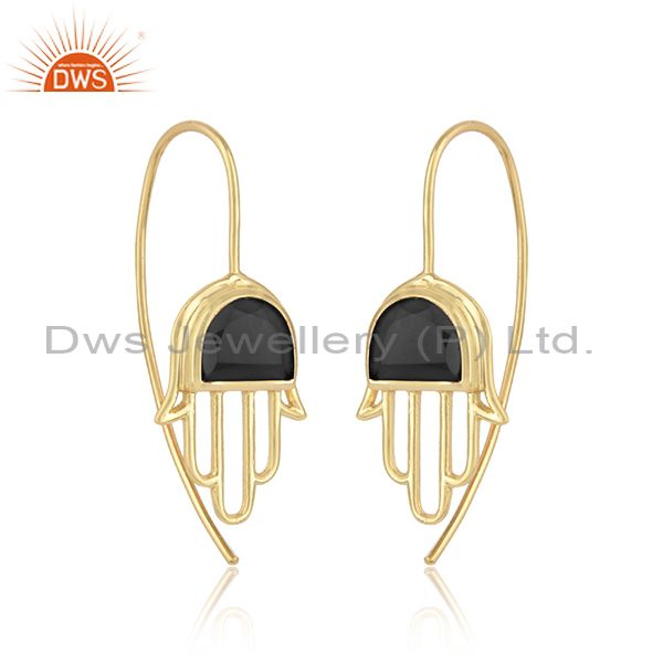 Handcrafted Hamsa Yellow Gold On Silver Studs With Black Onyx
