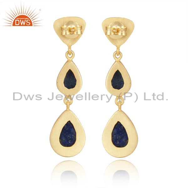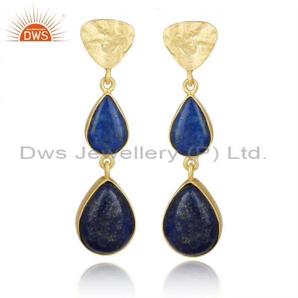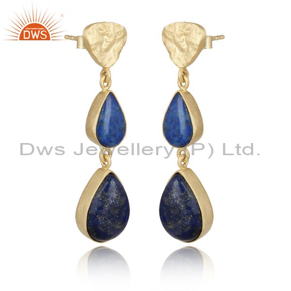 Handcrafted Textured Gold on Silver Long Dangle with Lapis