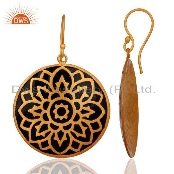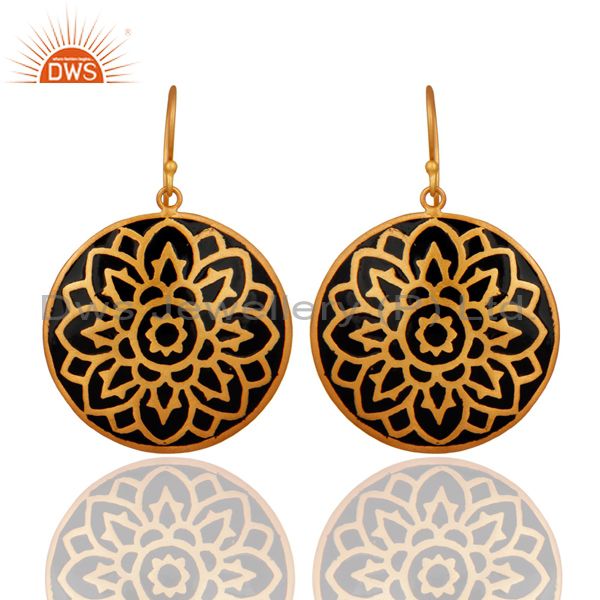 Handmade 18K Yellow Gold Plated Black Enamel Floral Design Hook Dangle Earrings