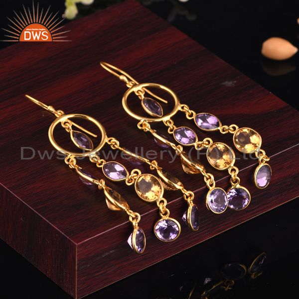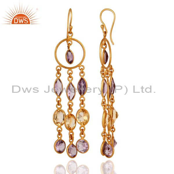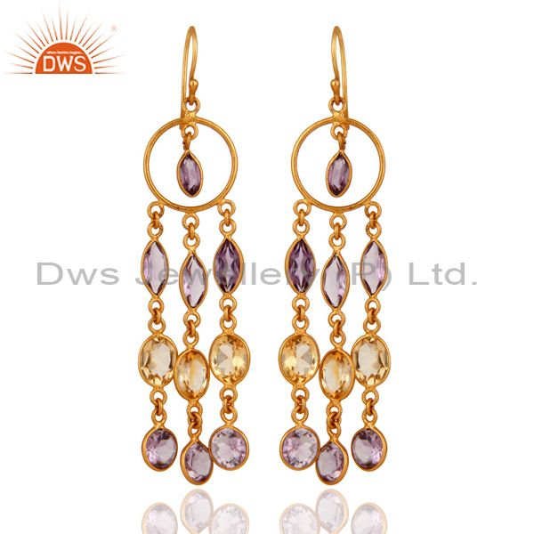Handmade 925 Sterling Silver Citrine And Amethyst Gold Plated Dangle Earrings