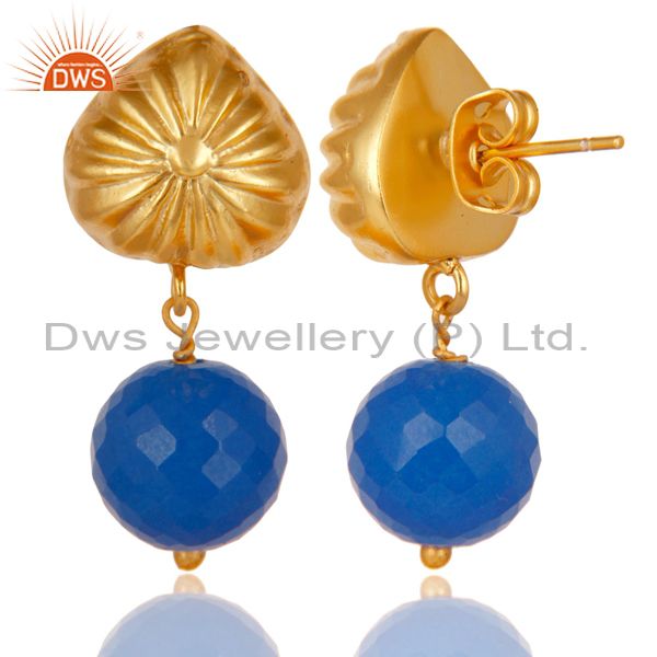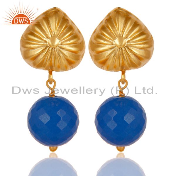 Handmade Art Dyed Blue Chalcedony Drop Brass Earrings In 14K Yellow Gold Plated