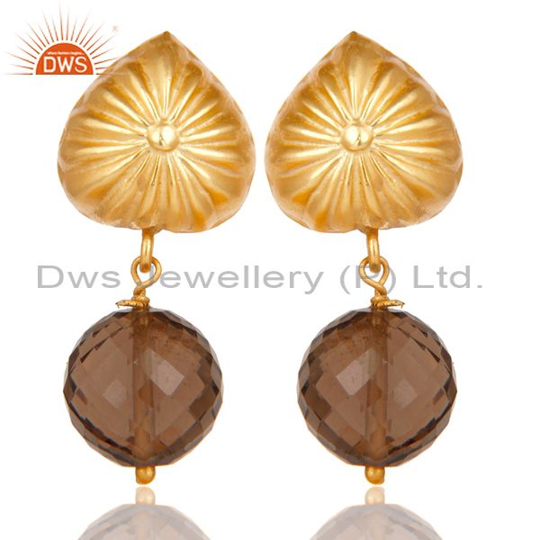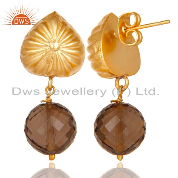 Handmade Art Faceted Smokey Topaz Drop Brass Earrings In 14K Yellow Gold Plated