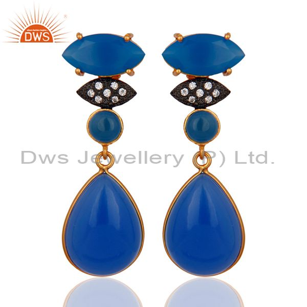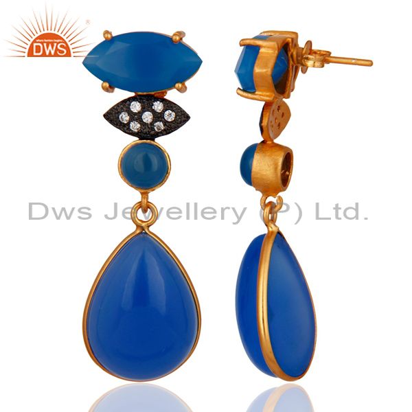 Handmade Bezel-Set Blue Aventurine And Cz Yellow Gold Plated Drop Earrings