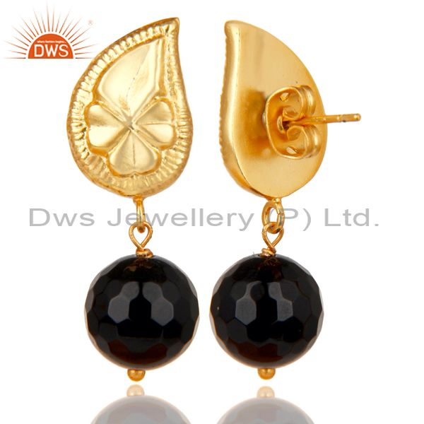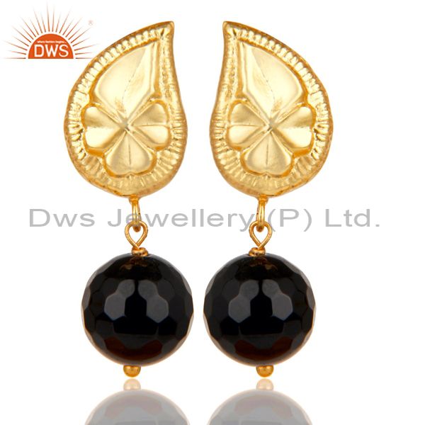 Handmade Flower Carving Black Onyx Drops Brass Earrings Made In 14K Gold Plated