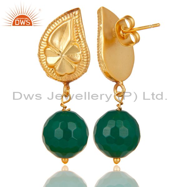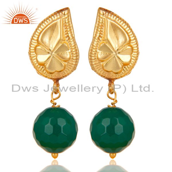 Handmade Flower Carving Green Onyx Drops Brass Earrings Made In 14K Gold Plated
