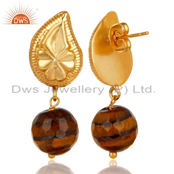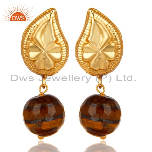 Handmade Flower Carving Tiger Eye Drops Brass Earrings Made In 14K Gold Plated