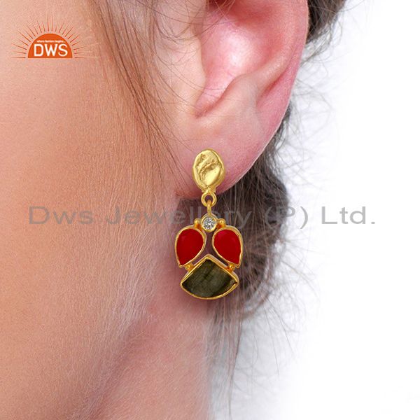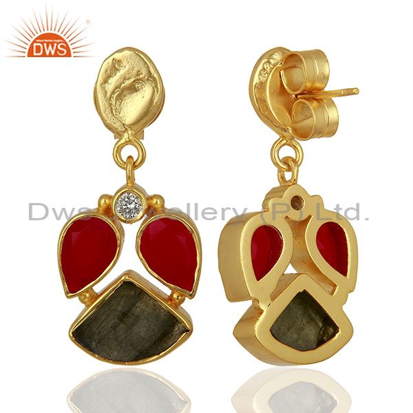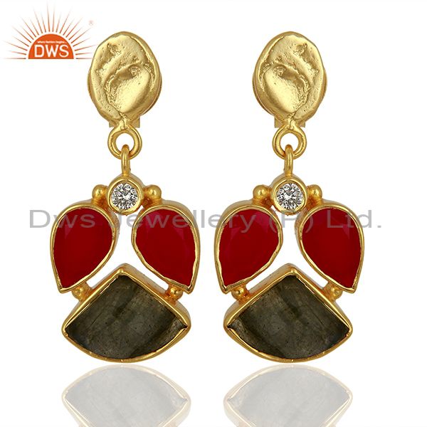 Handmade Labradorite And Chalcedony Gemstone Earrings - Yellow Gold Plated