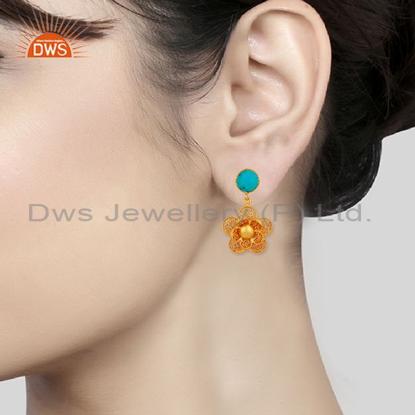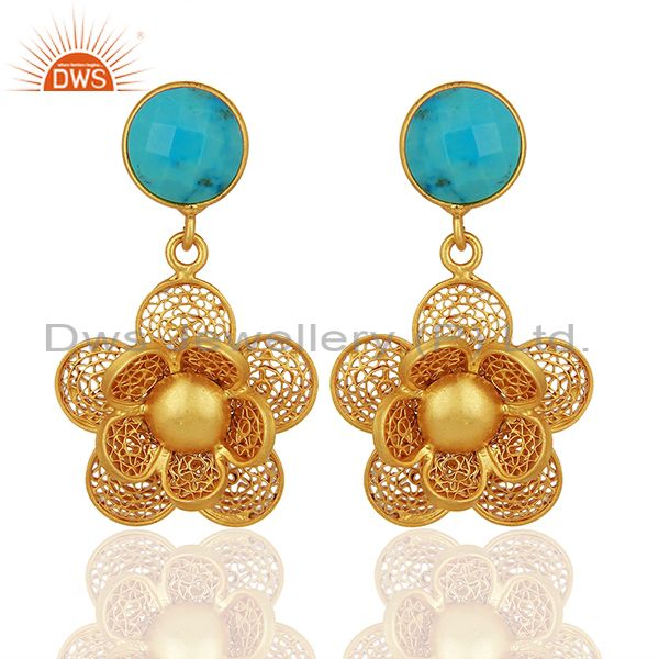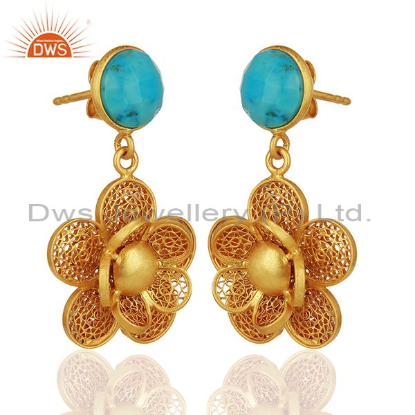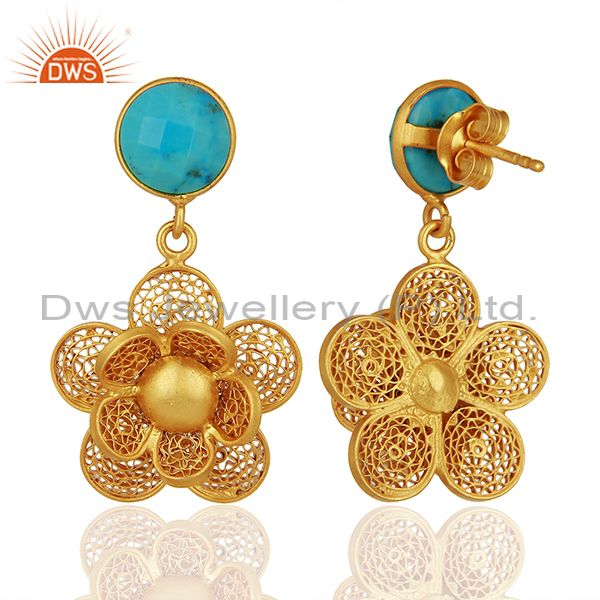 Handmade Natural Turquoise Flower Design Filigree 925 Sterling Silver Earrings