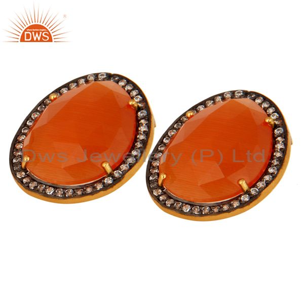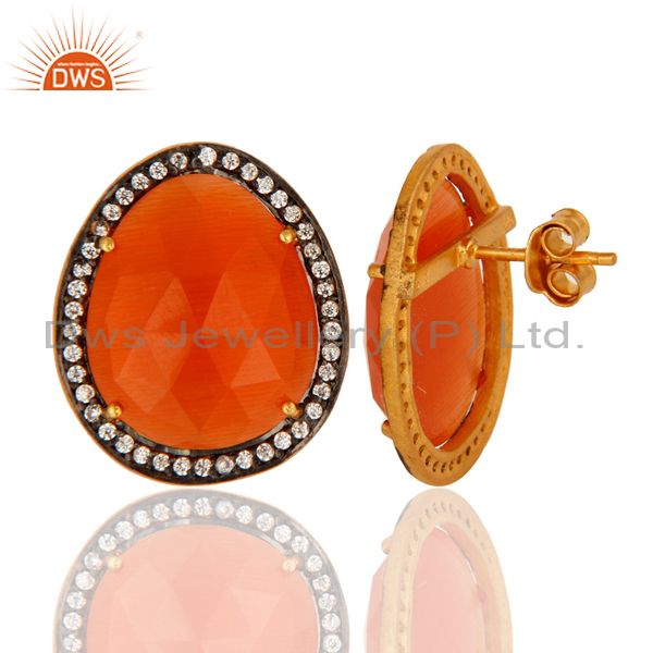 Handmade Peach Moonstone Stud Earrings With CZ In Gold Plated On Sterling Silver