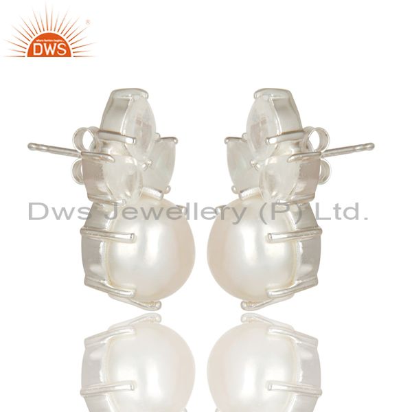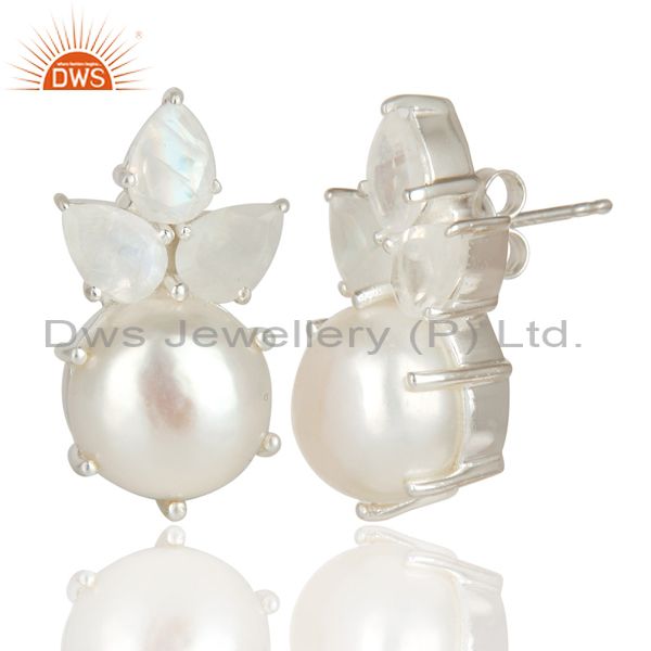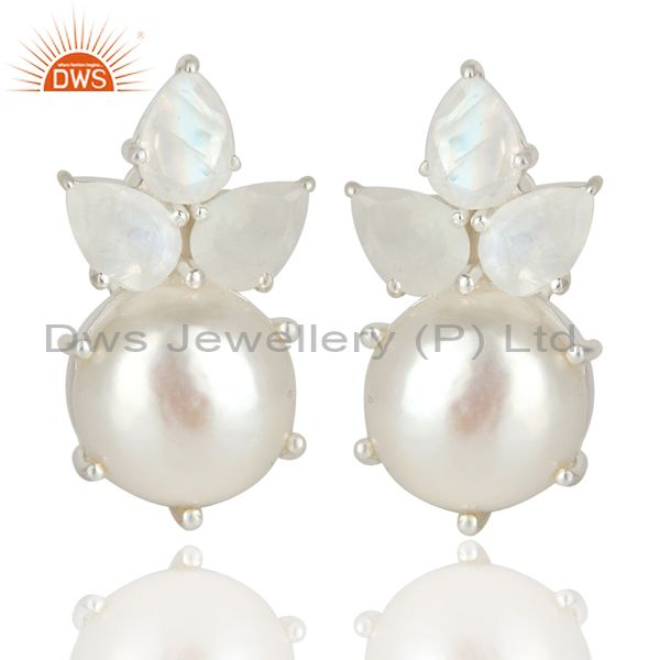 Handmade Solid 925 Sterling Silver Pearl & Moonstone Prong Set Studs Earrings