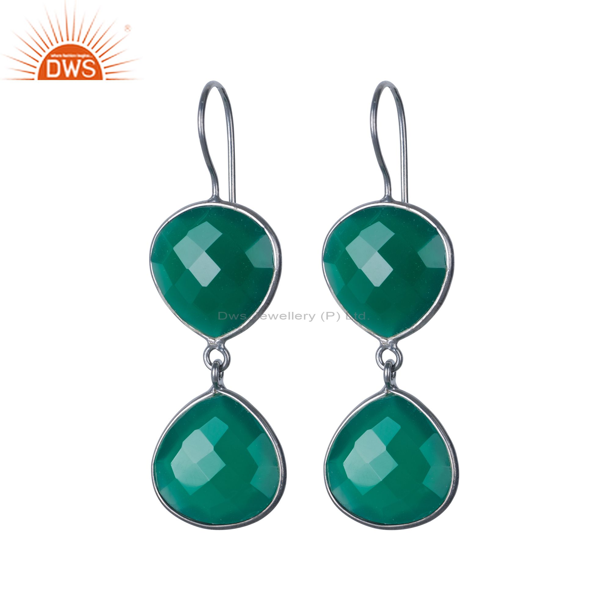Handmade Solid Sterling Silver Green Onyx Bezel Set Double Drop Earrings