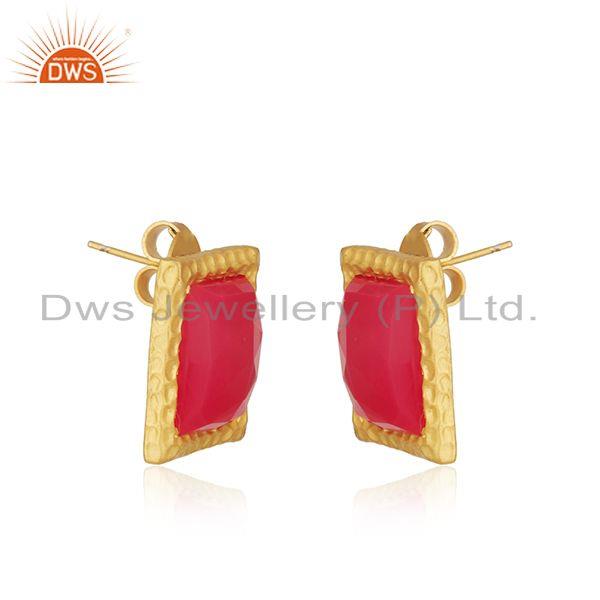 Handmade Square Brass Fashion Pink Chalcedony Gemstone Stud Earrings