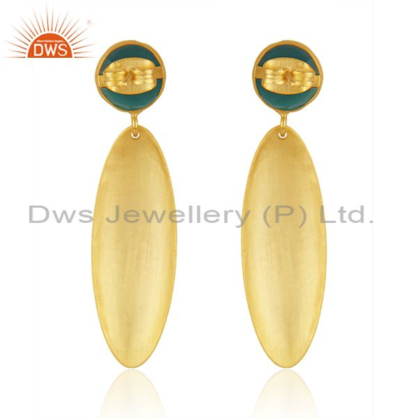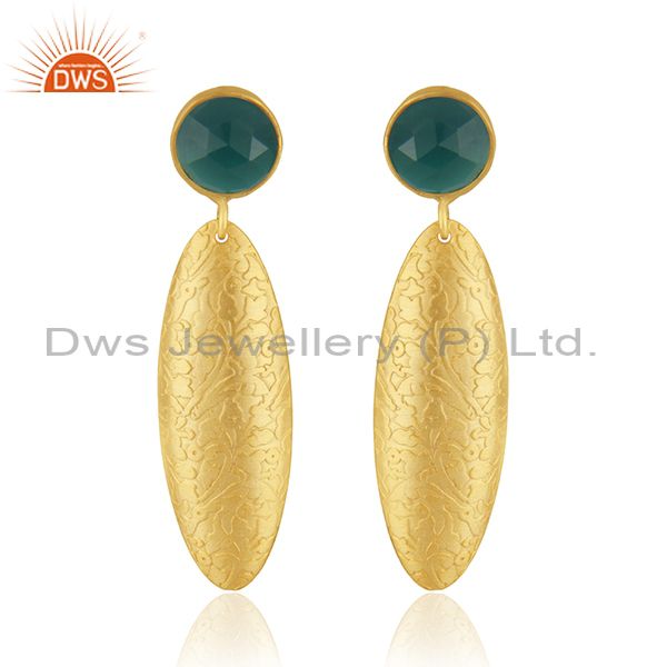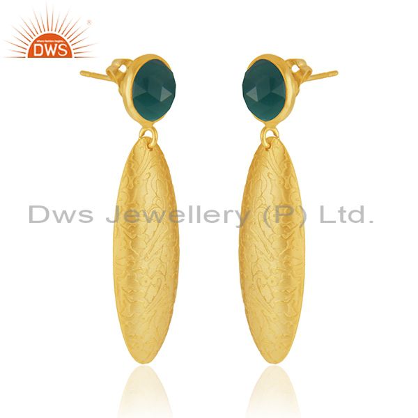 Handmade Texture Gold Plated Brass Green Onyx Gemstone Fashion Earrings Jewelry